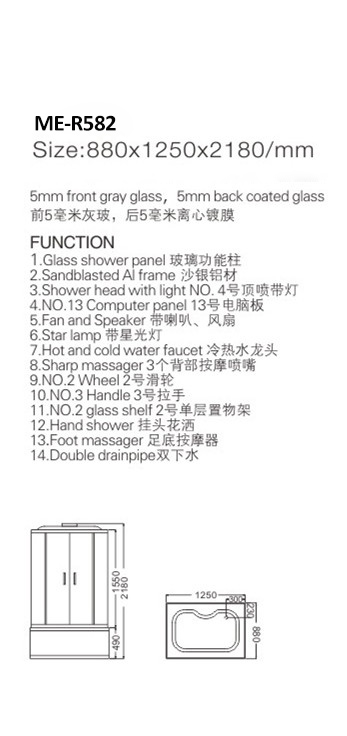 शावर बेस | 1.Shower सिर 2. स्टार प्रकाश 3.Fan 4.Speaker 5. टच स्क्रीन नियंत्रण कक्ष 6. ब्लू दांत 7.faucet 8.गल्स शेल्फ 9.Hand बौछार 10. स्टीम सिस्टम 11. फूट मालिश 12. बॉडी मालिश 13.डिजिटल टीवी 14.Radio 15.LED प्रकाश 16.Seat 17. बैक तकिया दूसरों ..... |